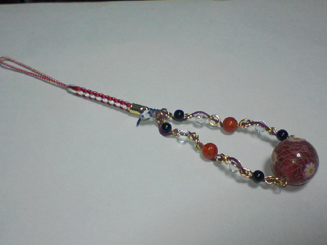 さておき、使用したのはブラックオニキス・クリスタル・カーネリアン・トンボ玉。モチーフたちをぐるりと取り囲んでいるのはロマンスコードと呼ばれるコットンの紐(を、皮っぽく加工したもの)です。補強の意味と、和風テイストを付加するために使用。