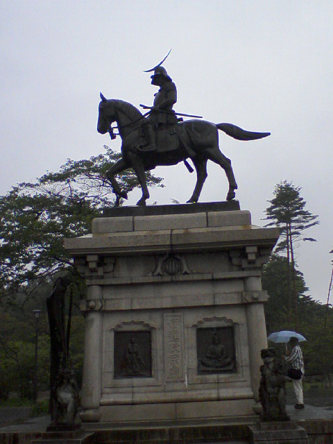 ありえないくらいの土砂降りの中撮った、伊達政宗公の像。