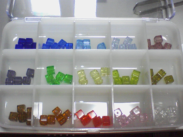 色味は、左上段からコバルトブルー・サファイア・アクアマリン・ライトバイオレット・ライトアメジスト・アメジスト・グリーン・ライトグリーン・ペリドット・カーキ・ディープブラウン・ライトブラウン・ファイアオパール・ライトローズ・クリスタル。
