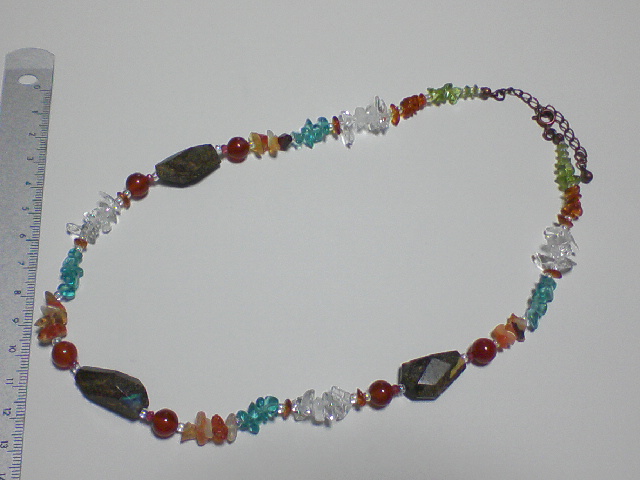 使用した天然石は、ボルダーオパール(ちょびっとだけ遊色効果あり)・レッドスピネル・カーネリアン・ファイアオパール・アパタイト・クリスタル・バルティックアンバー・ペリドット。