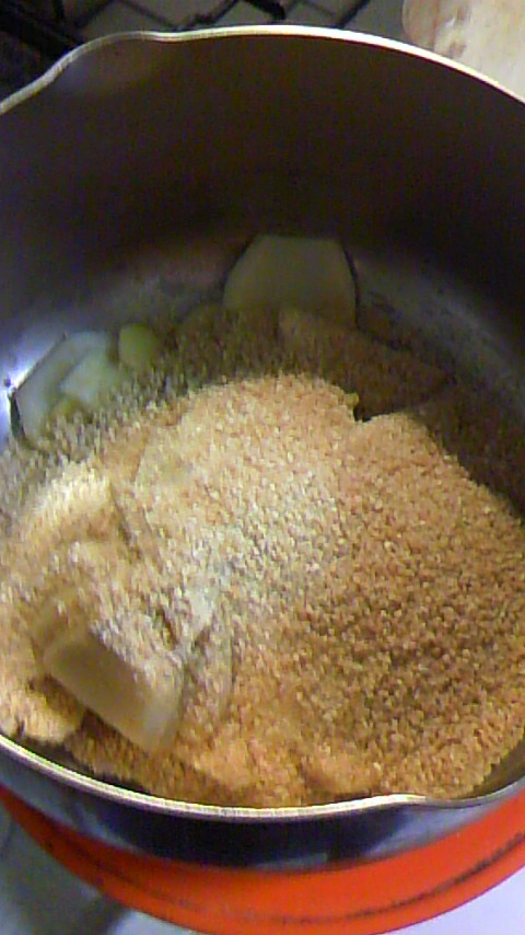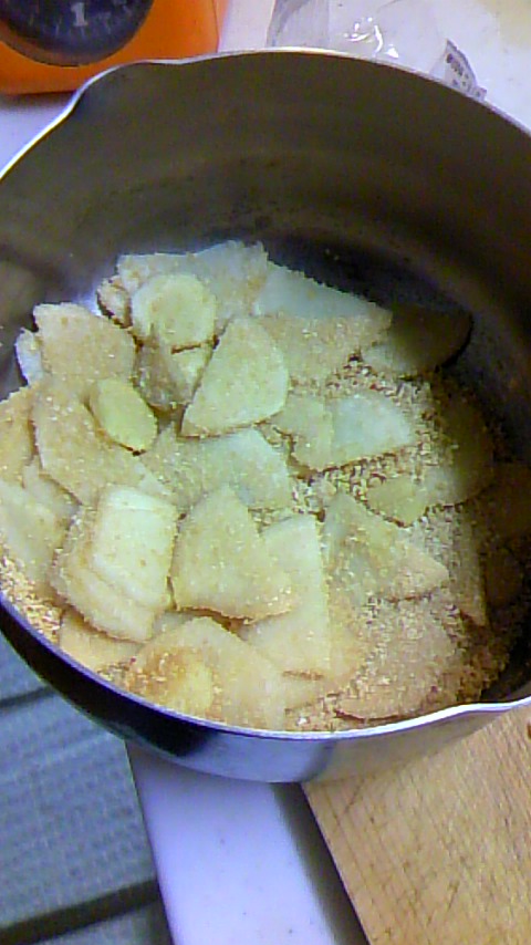 (この時、生姜全体に砂糖が行き渡るよう鍋を回す)