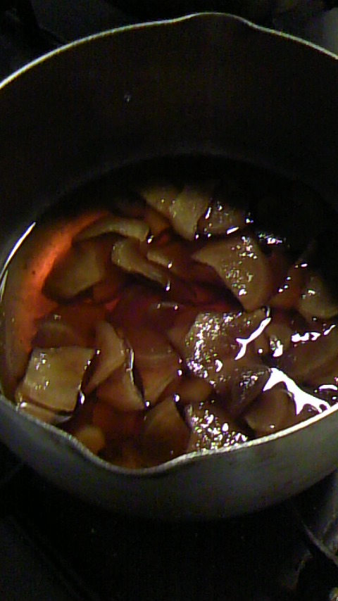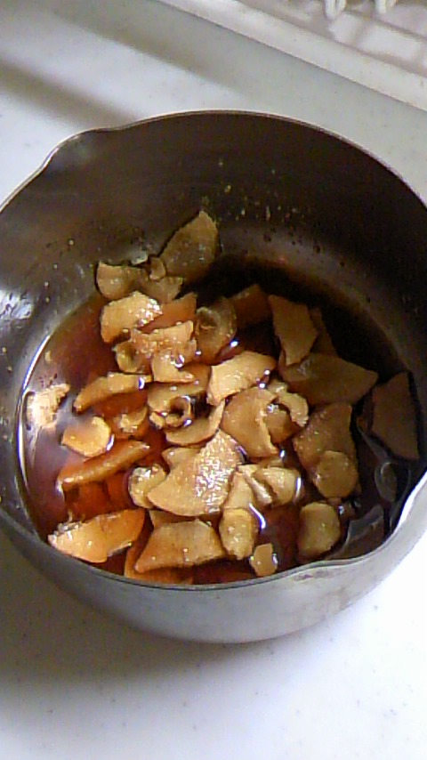 濃いのが好きならもっと煮詰めてもいいですが、あまり煮詰めすぎると生姜飴みたいにねっとりしてきますのでご注意を。ちなみに、私が最初にやった失敗です。