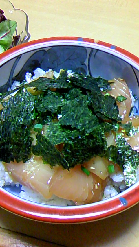 その上からちょっとガスの火で炙った(危ないので気をつけて炙ってね)焼き海苔を細かく千切ってまき、漬けダレを大さじ一杯ほどかければ出来上がり。
