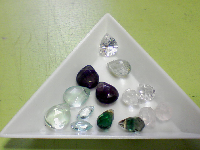 クリスタル(コンケーブ・カット)、クリスタル&ローズクオーツ&グリーンクオーツ(ドロップ・カット)、アクアマリン(マーキス・ブリオレットカット)、フローライト二種(ペアシェイプ・ブリオレット・カット)