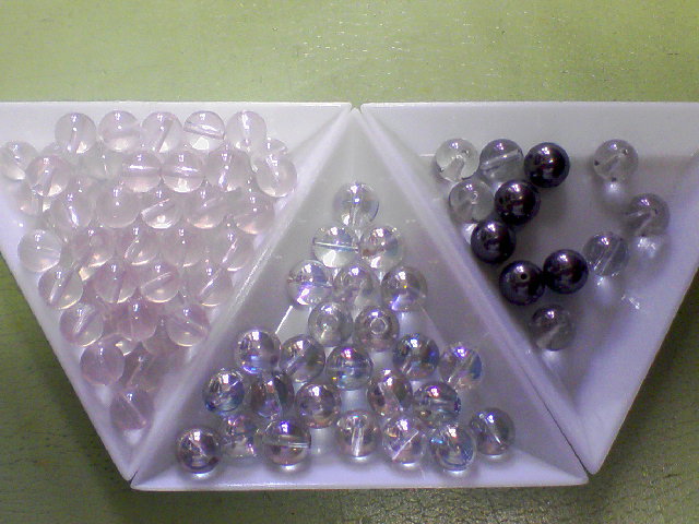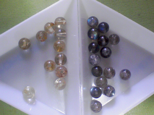 左から、スターローズクオーツ、オーロラクリスタル、ダークオーラ&チタン。お守りブレスレット用の材料です。チタンとか、すごい光沢が渋くてカッコいいですよ。どうやら身体にもいいらしいです、これ。