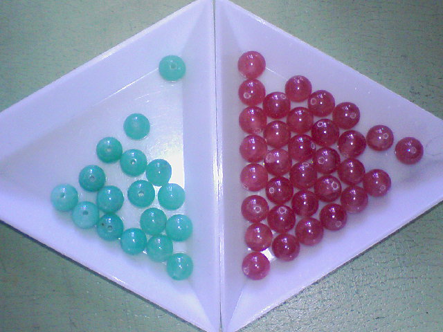左はビーズナーで買った2Aのクリソプレーズ、右はケンケンジェムズで買った2Aのペルー産インカローズ。インカローズの実物は、写真で見るよりも、落ち着いた印象の赤です。