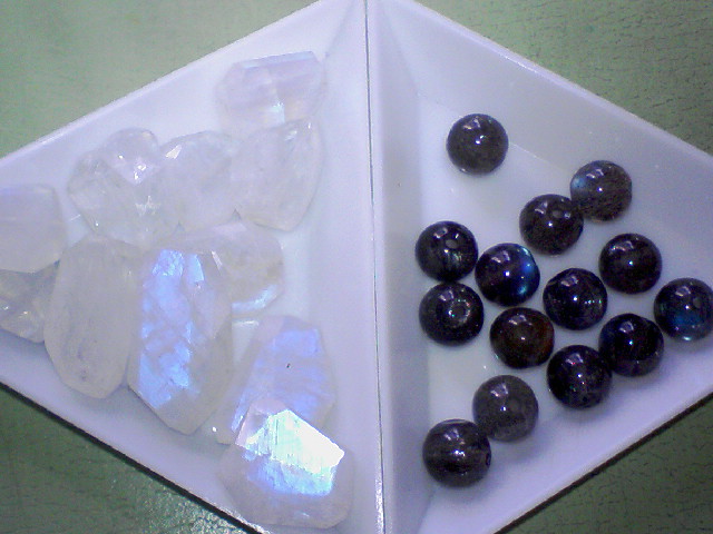 レインボームーンストーンのMサイズタンブルと最高品質のラブラドライト。ラブラドライトは輝きのあまりの美しさに涙が出ました。おまえ、美人すぎるよ……!
