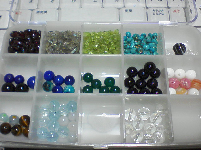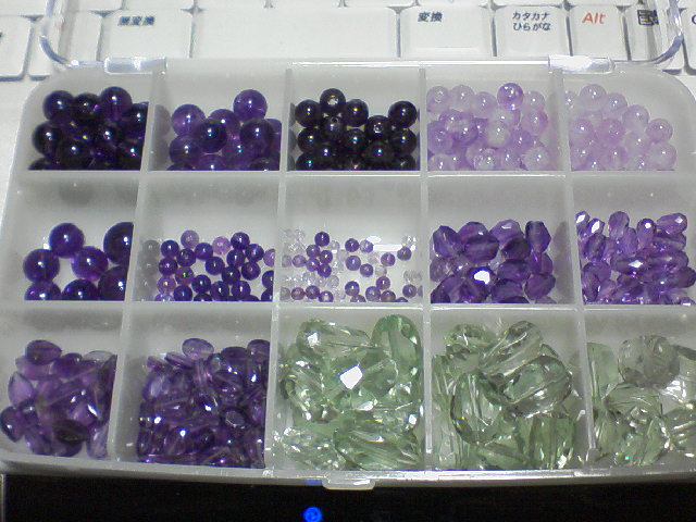 ブレスレットに使うのは、一番上か、右下のグリーンアメジストタンブルになるんじゃないかと。