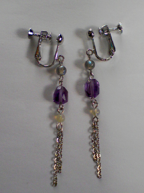こちらは我が最愛のラブラドライト3AにアメジストAA-のタンブル、そしてノーブルオパールを使ったイヤリング。