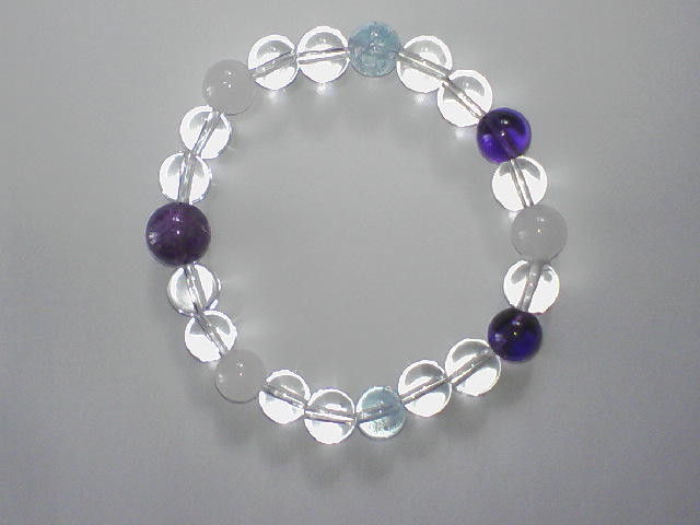 ラスト、アメジスト2A及び3A、アクアマリン、クリスタルにホワイトジェードを使ったお守りブレスレット。